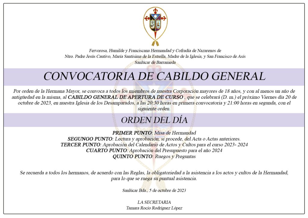 Por orden de la Hermana Mayor, se convoca a todos los miembros de nuestra Corporación mayores de 18 años y con, al menos, un año de antigüedad en la misma al Cabildo General de Apertura de Curso, que se celebrará (D. m.) el próximo viernes día 20 de octubre, en nuestra Iglesia de los Desamparados, a las 20,30 horas en primera convocatoria y 21:00 horas, con el siguiente orden del día: