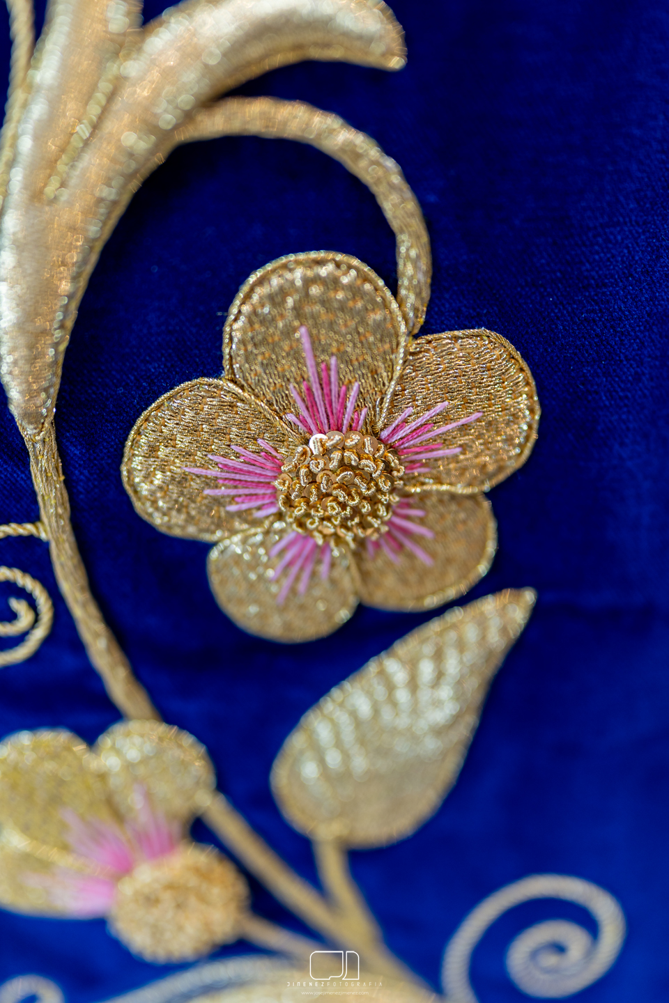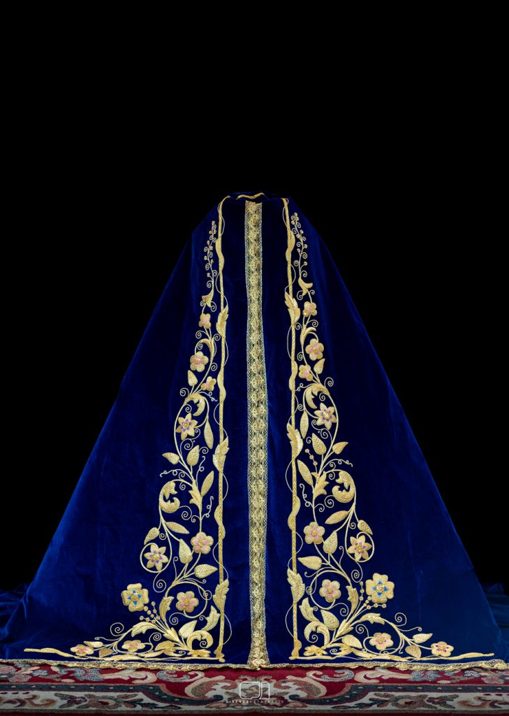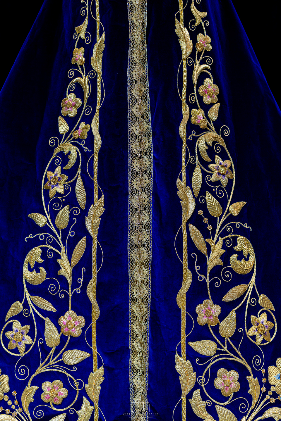 Desde el año 2017 y dentro del programa de actividades de nuestra Hermandad, se creó un taller de bordado en oro, con el objeto de promover este tipo de artesanía y a su vez enriquecer el patrimonio de la Hermandad. Con las piezas que l@s aprendices fueron iniciándose, se realizó una composición para la confección de un manto de camarín para nuestra titular. El diseño del mismo de D. José Luis Moreira Bernal, obedece al estilo del bordado sevillano clásico, compuesto por motivos vegetales, como hojas y flores entrelazadas. Todo ello realizado en oro entrefino sobre terciopelo azul.