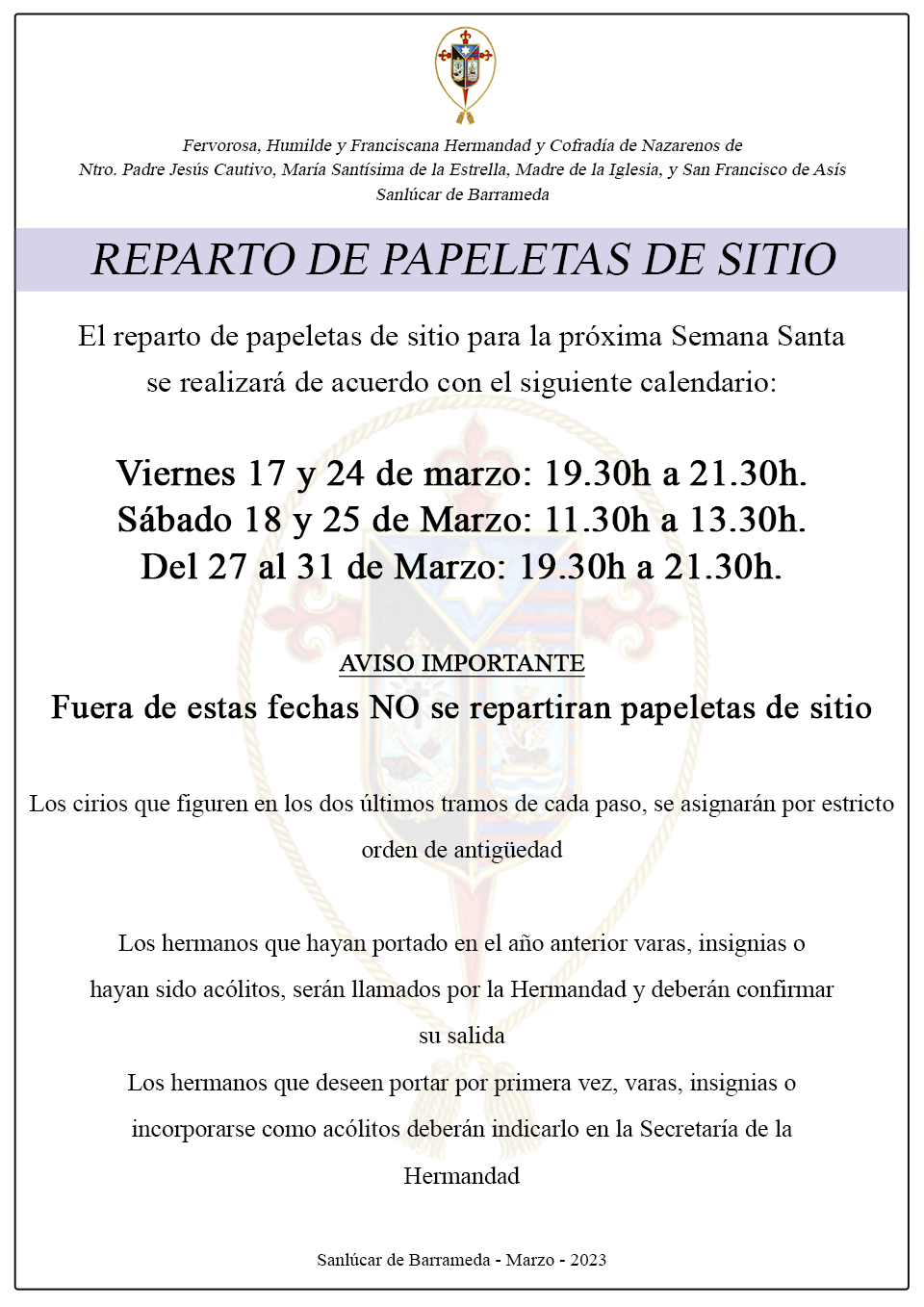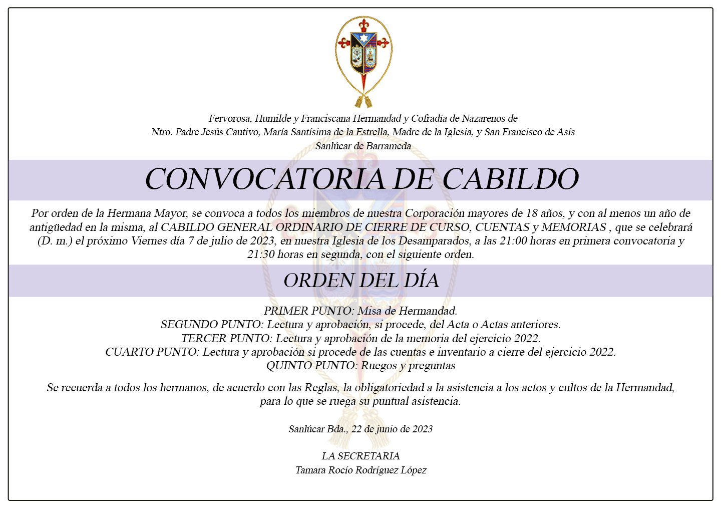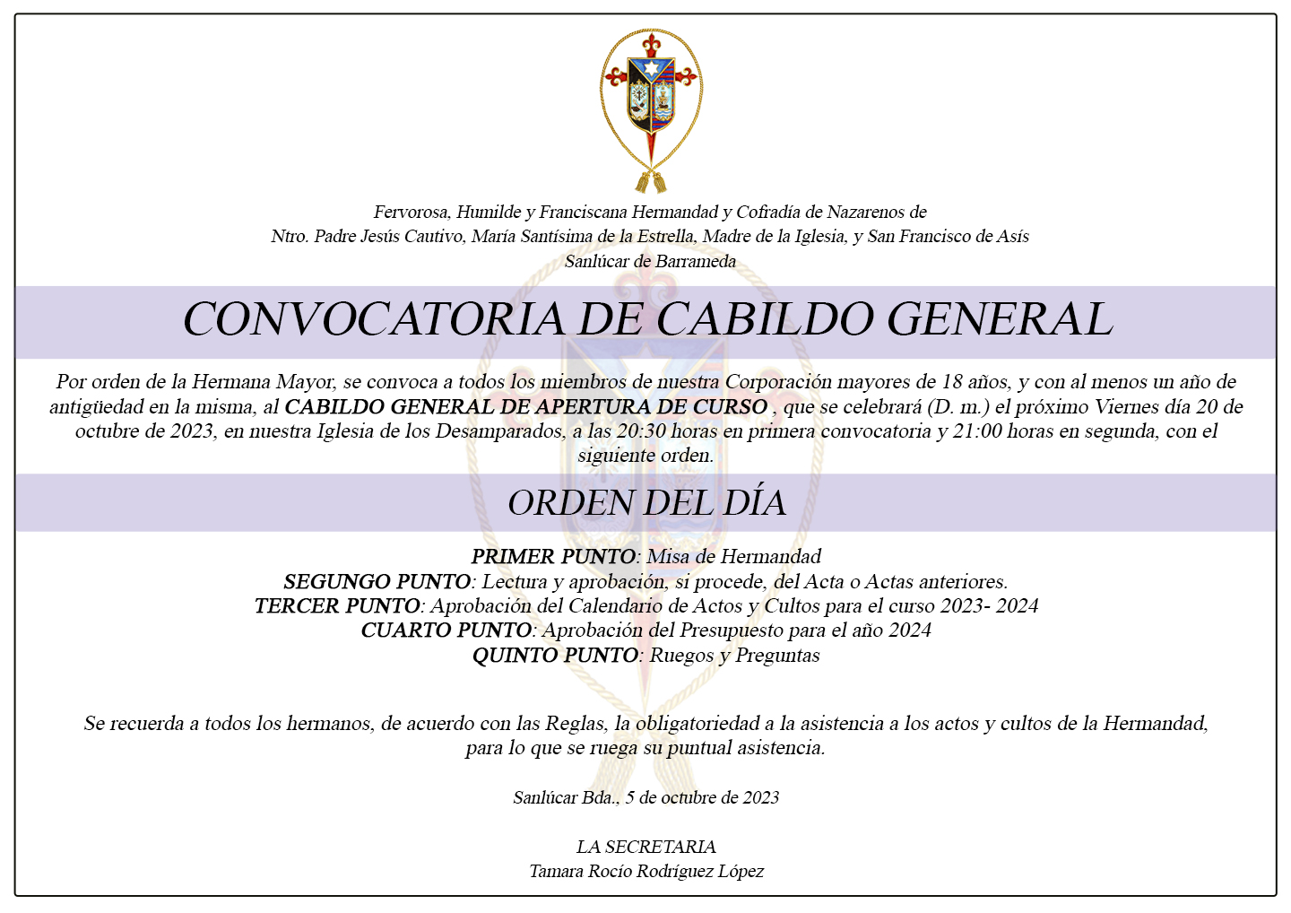 Por orden de la Hermana Mayor, se convoca a todos los miembros de nuestra Corporación mayores de 18 años y con, al menos, un año