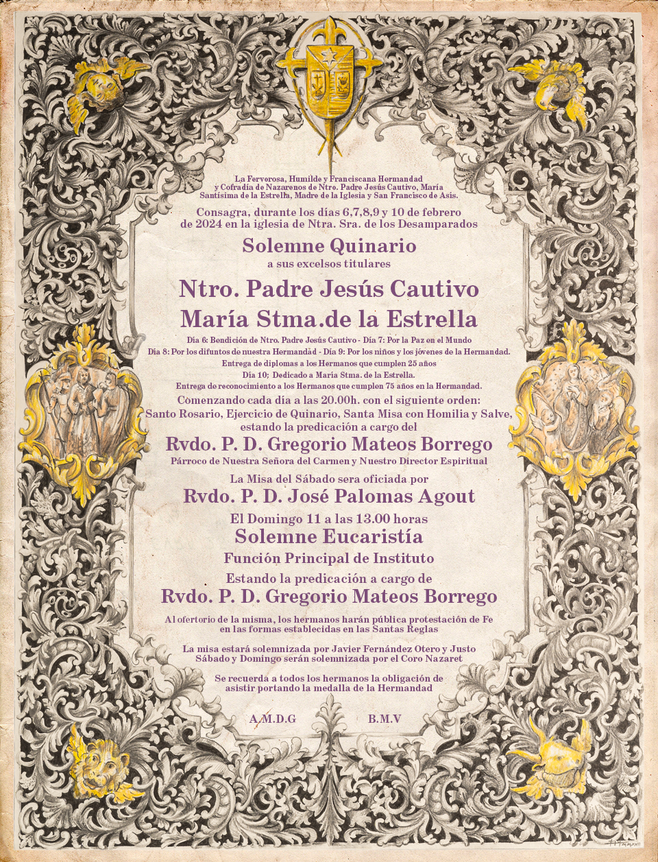 Durante los días 6,7,8,9 y 10 de febrero de 2024 en la iglesia de Ntra. Sra. de los Desamparados, tendrá lugar el Solemne Quinario dedicado